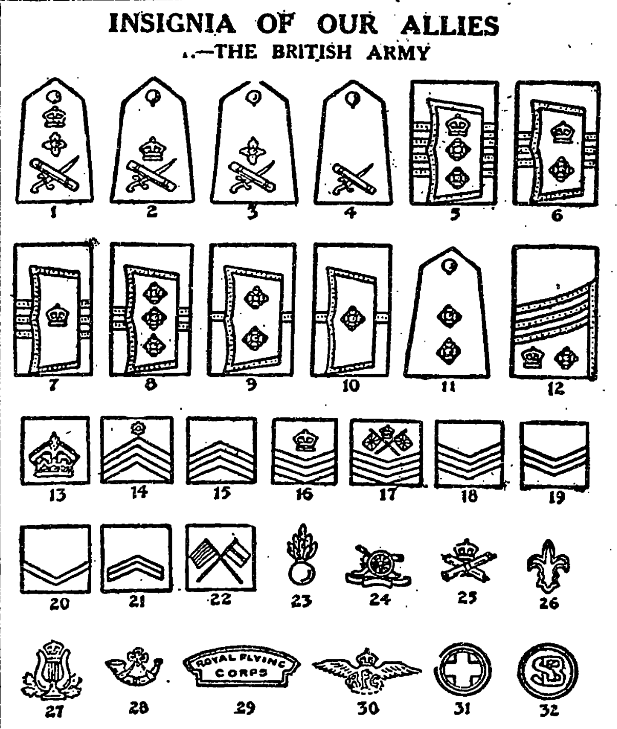 During World War I, the American Army was a mostly volunteer force with a very small professional military. With this mostly volunteer force it meant it now had an Army with very little knowledge on many military topics that professional soldiers would know. A large number of American Doughboys had a very quick basic training in America with the idea that Doughboys would receive more detailed training upon arrival in France. As Doughboys hurriedly arrived in France they now had to learn a lot of information on a range of topics. It was extremely common for the detailed training to be completed by their British and French Allies. This created a problem of Doughboys not having any knowledge of French and British rank insignia for the officers and other ranks they were being trained by. This cheat sheet was created to help Doughboys learn the insignia of their British Allies. This cheat sheet breaks down British insignia from Generals all the way down to the lowest soldier as well as a number of different branches and positions. It was instructed that this cheat sheet should be cut out for easy reference in case a Doughboy did not recognize the rank. Items like this cheat sheet were created for Doughboys to help assist at a chaotic time as the underprepared US Army raced to try and prepare itself for fighting on the Western Front.